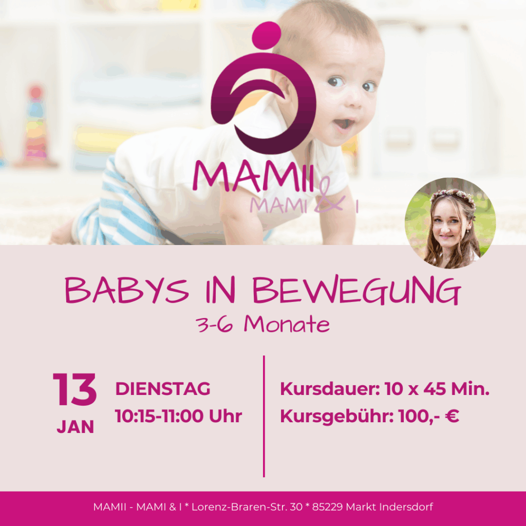 BABYS IN BEWEGUNG ist ein liebevoll gestalteter Babykurs, den wir bei MAMII mit viel Herz, Erfahrung und Fachwissen anbieten. Im Mittelpunkt steht die ganzheitliche Förderung Deines Babys – durch altersgerechte Bewegung, spielerisches Erkunden und intensive Eltern-Kind-Zeit.