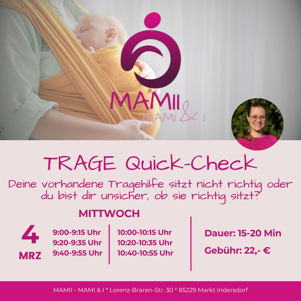 Du bist Dir unsicher, ob Deine Babytrage richtig sitzt? Beim TRAGE-QUICK-CHECK prüfe ich in nur 15-20 Minuten, ob Deine vorhandene Trage optimal eingestellt ist – für maximalen Komfort und eine gesunde Haltung Deines Babys.